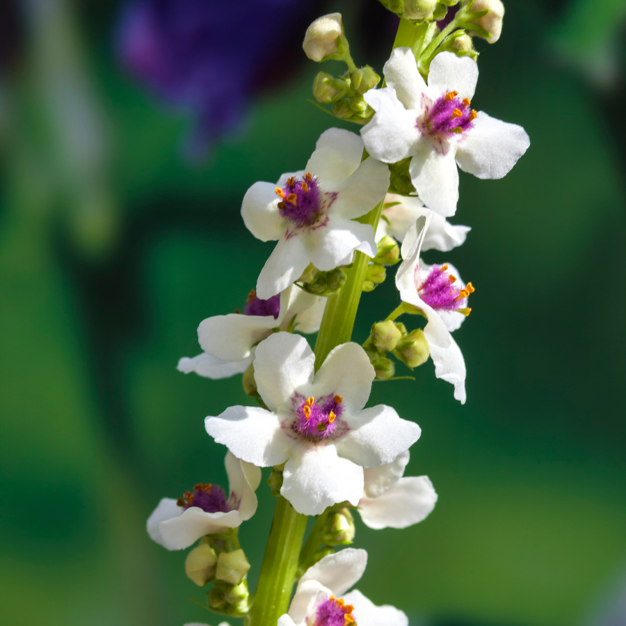 This plant, like our other Mullein plant, has fuzzy leaves and long, spiky stems that display countless beautiful flowers. The main difference is the bloom color - this plant will produce white flowers with a purple center. It's also worth noting that this plant does not have the same medicinal values as the other Mullein plant.